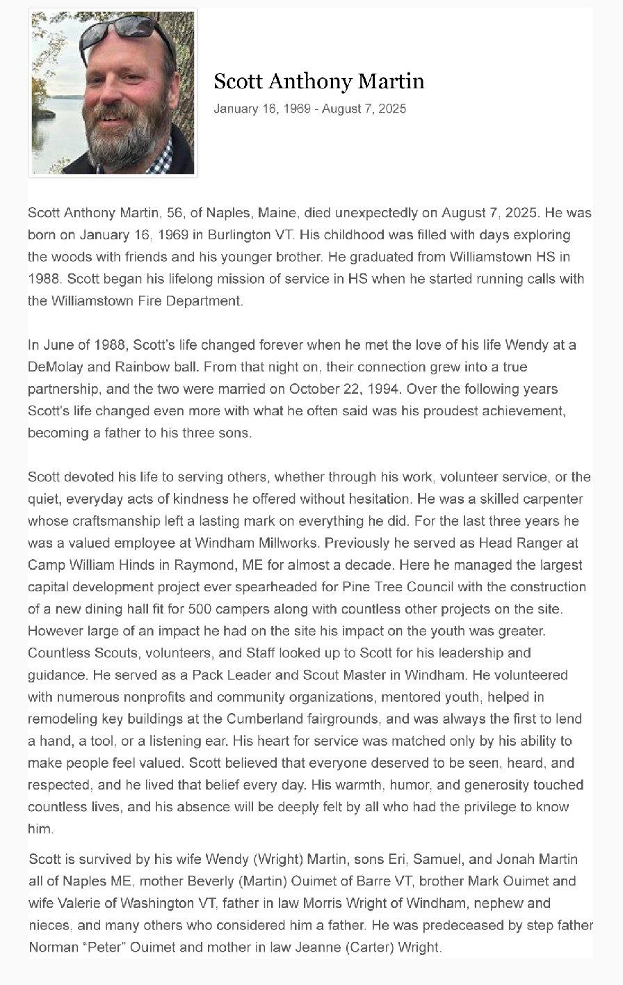 It isn't easy to find the words. The depths of my loss have not yet fully settled. I wander through my days, rudderless, seeking to understand the emotion I am feeling. On Thursday, August 7th, Scouting and the larger Maine Community lost, from our daily experience, one of our finest men, Scott Anthony Martin, 56, of Naples, Maine. The tragic account of his death has been widely circulated in our local news. None could describe the shock and loss so many of us are feeling. I first encountered Scott when he was the Ranger at Camp Hinds in Raymond. My son, Jamie, was a Cub Scout. Jamie and his many friends from Pack 800 loved Camp Hinds and the many places to wander and explore. Encountering Scott for the first time, I was impressed by his warmth for those of us who were leading that day. His hospitality was exceptional. His concern was that our experience, and more importantly, that of the Youth* we were guiding, met our every expectation. Scott went beyond those expectations when he offered resources that we didn’t know were available to us. The leaders and the Youth felt valued. A few years later, as my son advanced into Troop 800, we were joined by Scott and his family seeking a new Scouting home. Here we met his sons Sam and Jonah, who became an immediate resource for the Boys of the Troop as their experience of Scouting and in the outdoors was extensive. Scott’s oldest son, Eri, had already earned his Eagle Award at Troop 51, where Scott had been the Scoutmaster. Scott was a treasure trove of information that would strengthen our Troop and make the outdoor program one of the strongest in the Council. Scott’s guidance concerning National Scouting’s regulations helped keep our young charges safe and the leaders knowledgeable. Sam and Jonah would eventually earn their Eagle Award with the Troop. Our Youth are better for knowing them. Why is this moment significant? Why, if you are new to Scouting, is Scott’s passing important? His life, his marriage to Wendy, and his family of three young men stand as a model for family life heavily influenced by the very best Aims and Methods that Scouting has to offer. Scott and Wendy embraced Scouting’s purpose of developing in their family of three Boys qualities of honesty, self-respect, and respect for others. They used the resources that Scouting has evolved over its long history to develop in their sons the ability to lead, to be strong citizens, and to lead healthy lifestyles. The results are plain to see. Eri, Sam, and Jonah are fine examples of what is possible when Scouting’s values are interwoven into the fabric of family life. I have been involved in many Youth activities: baseball, soccer, basketball, and more. I have supported numerous Youth academic activities and played a leadership role in some. I can tell you from forty years of experience serving Youth, none come close to Scouting for developing the “whole person”! None. In the months after I retired, I helped Scott and other volunteers for a day a week at Camp Hinds. It was here that I became aware of the man’s capabilities. I was also made aware of the incredible responsibility of a Scout Ranger! I would arrive at camp early, and after a fast cup of coffee, Scott would direct our activities. We would work with him as he guided us with his extensive carpentry skills to make repairs and improvements that would create a better place for our Youth to enjoy their camp experience. Within minutes, Scott would receive a call from the other end of camp, where his presence would be required. He would return an hour later to give us a hand, only to receive yet another call and the inevitable hasty departure. This would go on throughout the day and was an ever-present part of the Ranger’s job at Camp Hinds. Were it me, I would have no hair by the end of the week. Yet Scott tolerated it well, and his service there lasted over a decade, unusual for that type of position. I want to share one intimate moment that I think is important when understanding Scott Martin. Scott had me finishing the walls in the “guard shack” near the second parking lot. I was cleaning up for the day when Scott stopped by to check my progress and address any material needs I might have. We chatted for a few moments when Scott paused as we were taking in the vista of the athletic field, beautifully mowed. He shared that on days when he was alone at Camp and solitary in his thoughts, he experienced a “Presence” that gave him peace and hope. He told me that he had never experienced that anywhere else to that extent. I know of what Scott described. It’s there, present in the woods and waters of Camp Hinds. It’s present in the legacy of those who have come before us in the service of Youth. I am confident that our dear friend Scott is there now to support, guide, and love. As we remember Scott—with gratitude, sorrow, and deep respect—we must also acknowledge the weight of grief that accompanies such a sudden and profound loss. Grief is not a weakness, nor is it something to be hurried through. It is a natural, human response to love, interrupted. In the days and weeks ahead, I encourage each of us to honor our journey through grief. Speak with someone you trust. Reach out to a counselor, a spiritual guide, or a mental health professional. There is no shame in seeking support—only strength in choosing to heal. Scott spent his life helping others find their way. Let us now help one another do the same. With unconditional positive regard, ~ Bill Diffenderfer |