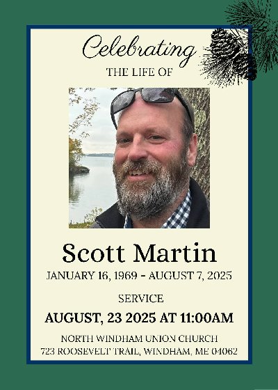 My father was one of the most caring, service-driven people I have ever known. His contributions to our community were countless. Through decades of dedication to Scouting, he inspired and guided thousands of young people, teaching not only outdoor skills but integrity, leadership, and the value of giving back. Outside of Scouting, his fingerprints can be found on countless community projects, fundraisers, service events, building projects, and quiet acts of kindness that no one ever heard about. Whenever there was a need, he was the first to roll up his sleeves, the first to offer help, and the last to seek recognition. To my mother, he was a true partner. They met in a moment that felt like a scene from a story, ball gowns and all. From that moment on, they became a force to be reckoned with. Together, they raised and supported three boys, each with their own unique challenges, never losing sight of the importance of supporting each other through it all. Their partnership was unwavering, always 100%. Through their example, they taught us the true meaning of commitment, resilience, and unconditional love. To know my father was to know someone who truly lived his values. He believed that a meaningful life was built on service to others, hard work, and the courage to be yourself. Helping someone in need wasn’t something you scheduled, it was something you simply did. Love, to him, was a verb, proven every day by the way you treat people. It wasn’t just our family who felt that love. Over the past day, I’ve heard from so many people whose lives he touched. He was one of the best role models many had the blessing to know, a father figure to more people than he could count, and someone who is deeply missed already. His patience and guidance helped countless scouts, gently nudging them out of their comfort zones and encouraging them to grow. His leadership in the Scouting community made him a major part of many families’ lives, always someone who made others feel seen, heard, and special. Beyond Scouting, he was a fixture in the Cumberland Fair and Farmers Club for many years, serving as a vendor and a dedicated volunteer. He contributed to projects like the new walls in the Exhibition Hall Marketplace and the renovation and restoration of the Fairgrounds Restaurant, always working tirelessly with passion, quality, and a smile. Friends remember him as someone who worked with joy and humor, and who was always there with a helping hand and a joke. His passing is a devastating loss to all who knew him. Many remind us to hug our loved ones tighter, to pick up the phone, or make time for a visit because life is fragile and moments with those we care about are precious and unpredictable. He was also a beloved part of the craft fair and event community, where friendships were formed over years of supporting and listening to one another. That community feels the sting of losing a friend who was always ready to help and offer a shoulder to lean on. In every circle he moved through, Scott Martin was the “epitome of a true gentleman” as one friend shared. His kindness, thoughtfulness, and enormous heart touched everyone he met. He made the boys he led in his Scout troops feel part of an extended family, and he made every person he encountered feel valued and special. His family and friends carry him with them always, honoring the fine man the world lost. These memories and the many expressions of love and respect show the life my father lived one filled with patience, encouragement, and the quiet but powerful ability to make people believe in themselves. As I drove home yesterday, my mind was racing. A thousand moments with him replayed. Family camping trips, projects worked on side by side, long conversations about life, and those quiet times where just his presence was comfort. What kept coming back to me was the immense love he poured into our family, our community, and anyone fortunate enough to cross his path. My father taught us all how to work hard, love harder, and be our authentic selves. His example is a legacy I will carry forward, even as my heart aches from his absence. He was more than my father, he was my role model, my teacher, my steady hand in the storm. And while his physical presence is gone, the lessons he lived will guide me for the rest of my life. ~ Eri Martin |